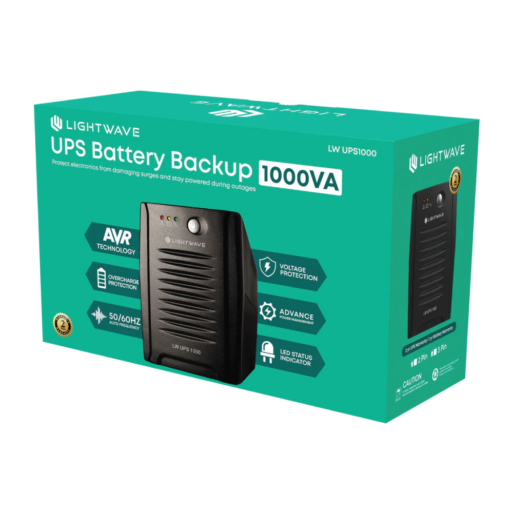 The Light Wave UPS 1000VA is designed to provide dependable backup power and high-level protection for your essential home or office equipment. With a robust 1000VA / 600W capacity, this UPS supports desktop computers, modems, routers, CCTV systems, POS machines, and other critical electronics, ensuring they remain operational during power failures and fluctuations.